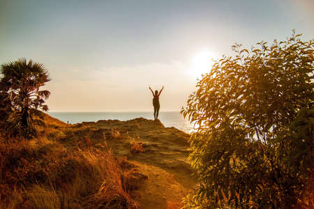 Asian Girl Tourist with backpack and a bottle of water standing on top of a hill with raised hands at sunset.