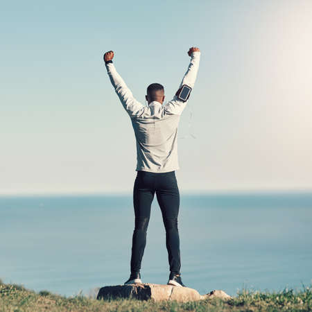 I did it. Rearview shot of an unrecognizable young man standing with his hands raised while exercising outdoors.