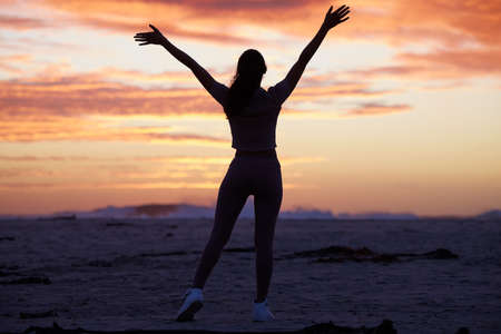 There is so much to enjoy in life. Full length shot of an unrecognisable woman standing alone on the beach with her arms raised.