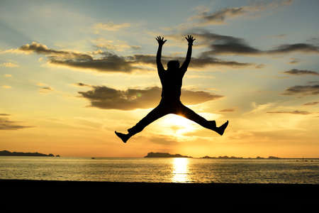 man jump high silhouette full of energy against sunset sky, energy