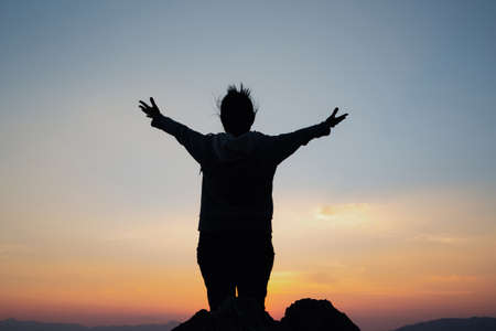 Silhouette of man hold up hands on the peak of mountain
