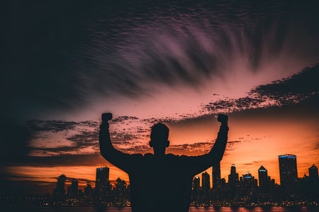 Silhouette male making triumph, winning and feeling happy concept outdoor at sunset with urban background. Man rising hand up, victory businessman concept and waving. High quality image