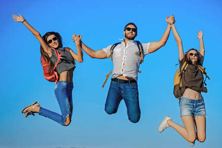 Happy friends, tourists jumping on mountain top on blue sky. Summer vacation. Traveling and hiking.