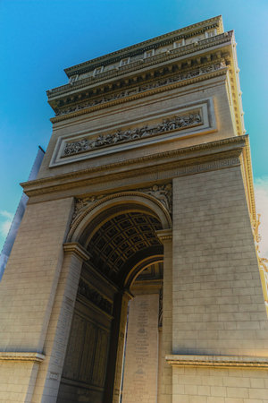 Portrait close view of famous iconic Arc de Triomphe with soft blue sky monument at the western end of the Champs-Elysees road in Paris, France-08.22.2019