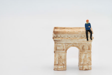 Miniature people: Businessman sitting on the Arch of Triumph, Paris, France