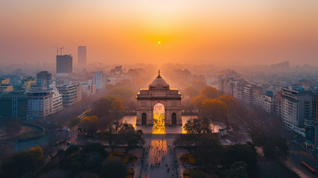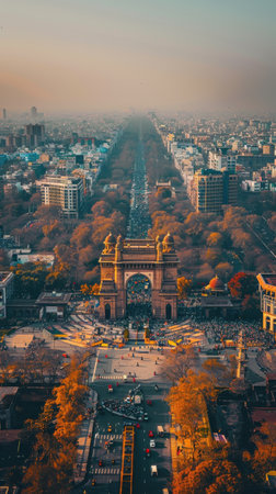 A cityscape with a large archway in the middle. The archway is surrounded by trees and people. The city is bustling with activity and the sky is a beautiful orange color