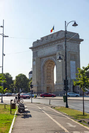 BUCHAREST, ROMANIA - AUGUST 17, 2021: Sunset view of Arch of Triumph in city of Bucharest, Romania