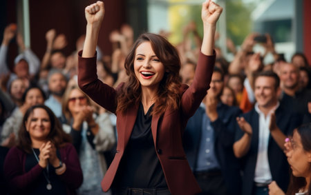 A woman is smiling and holding her hands up in the air. She is surrounded by a group of people who are also smiling and cheering. Scene is joyful and celebratory