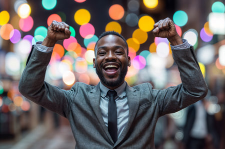 The businessman's victory. Happy manager in the office. Black man celebrating sucess. Business success in the capital.