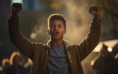 A young determined African American student, proud and confident, fighting and protesting with emotion and a raised fist against racism for rights, justice and equality - Black Lives Matter