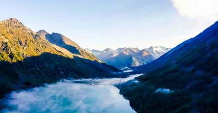 Aerial view of the river in the mountains at sunset. Austria
