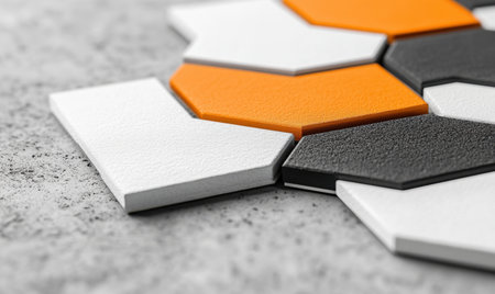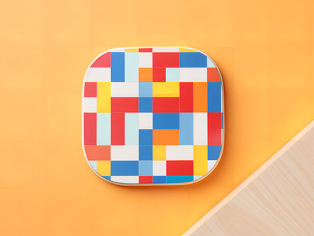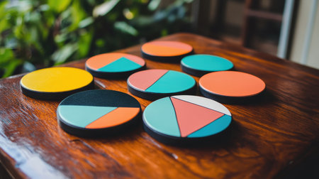 A set of colorful geometric coasters arranged on a wooden table, adding a playful touch to dining decor.