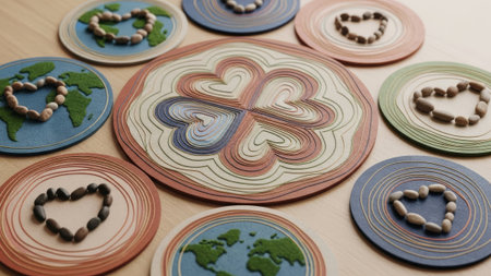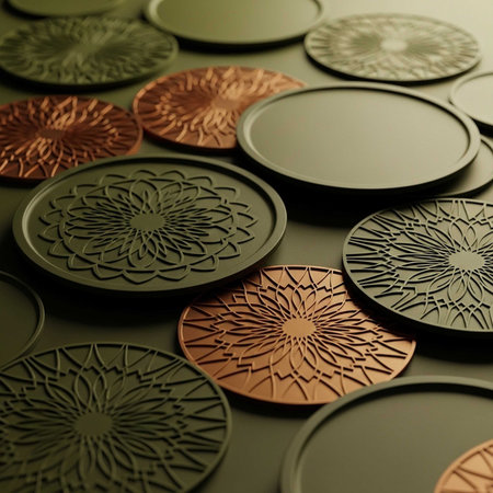 Wooden coasters with intricate engravings complement a modern coffee table setup, featuring a stylish coffee mug. the scene combines artistry and functionality, perfect for enhancing home decor or adding an artistic touch to everyday living.