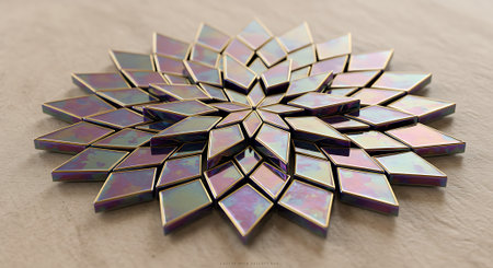 A circular object features a complex and intricate geometric pattern made of metallic and reflective materials. The precise, repeating design of squares and lines creates a modern, high-tech, or artistic medallion, viewed from above on a gray surface.