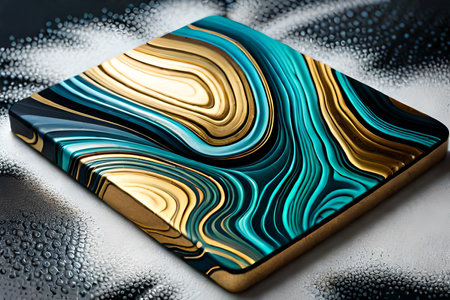 Wooden coasters with geometric patterns and cup of tea on black marble tray