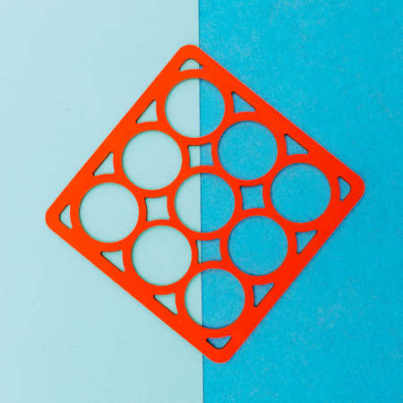 Old used kitchen stand under the hot, made of small flat wood pieces of rhombic shape and then decorative processed in the form of burning, front view on a gray background