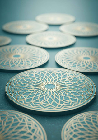 A collection of intricately designed blue and white coasters with gold accents on a matching blue surface