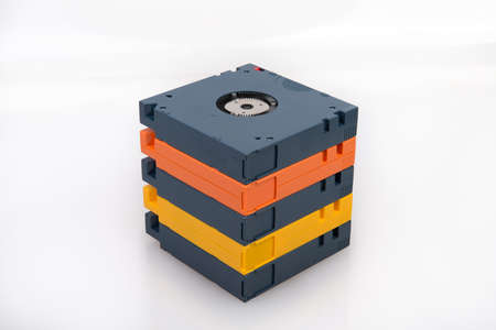 Several floppy disks of different colors on a white background, technologies of the past.