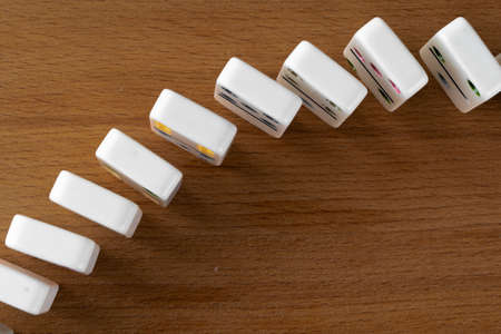 Dominoes on a orange background. Domino effect concept.