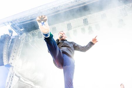 MOSCOW, RUSSIA - JULE 06, 2012: Vocalist Alexei Serov performs at a concert of the Disco Accident music band.