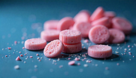 Group of pink candy tablets on a blue surface