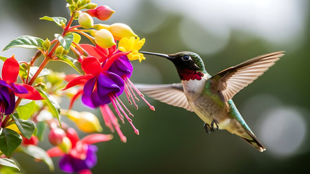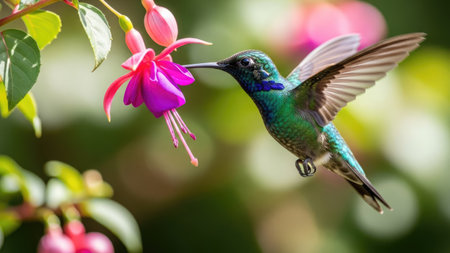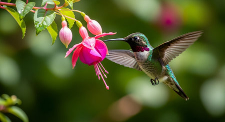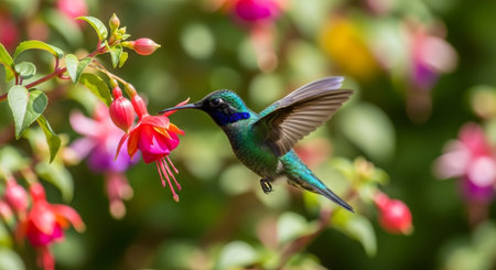 Hummingbird feeding on bright fuchsia flower in vibrant garden