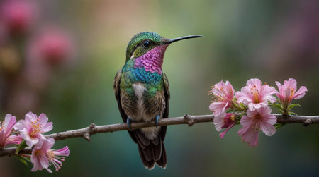 Vibrant hummingbird perches on branch with pink flowers against blurred background.Generative AI