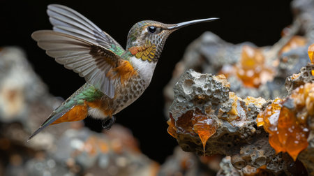A hummingbird hovering over an obsidian formation its rapid movement and vibrant colors juxtaposed with the stillness and darkness of the stone