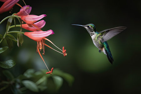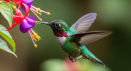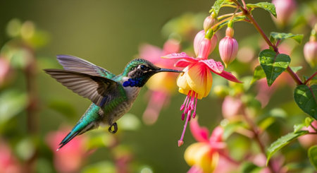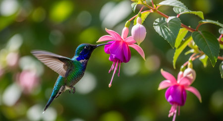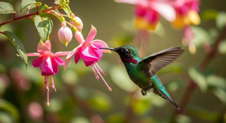 Vibrant hummingbird feeding on a beautiful pink fuchsia flower