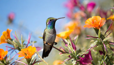 A vibrant hummingbird hovers near a bright pink and orange flower, extending its long beak to feed on the nectar. The bird's iridescent green and blue feathers shimmer in the sunlight, creating a stunning contrast against the delicate petals. The background is blurred, creating a dreamy and peaceful ambiance.