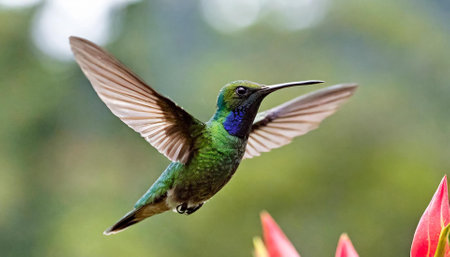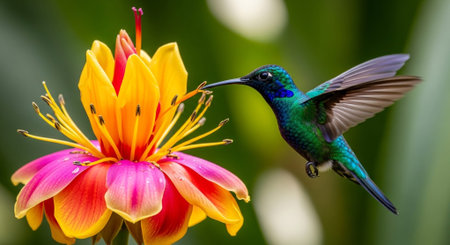 Colorful hummingbird captured in mid-flight against a rainforest backdrop, showcasing vivid feathers and exquisite wings. A stunning representation of nature and wildlife beauty.