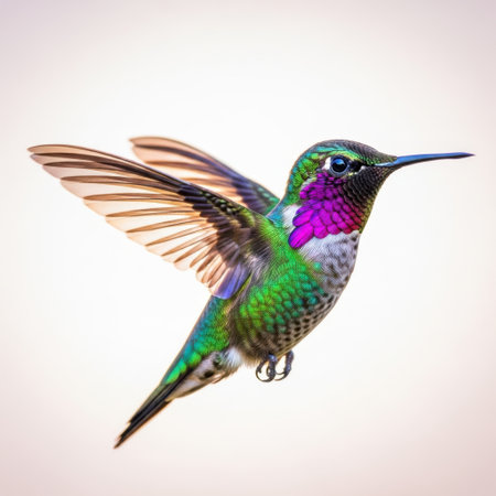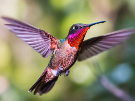 A vibrant hummingbird is captured mid-flight, showcasing its iridescent green and purple plumage. Its wings are spread wide against a soft, blurred green backdrop. The image utilizes natural lighting, emphasizing the bird's delicate features. Suitable for various editorial and commercial projects.