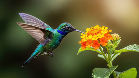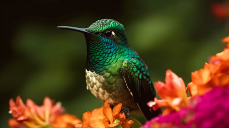 In a serene moment, a hummingbird with striking green feathers delicately hovers near an orange flower. The gentle warmth of the setting sun casts a soft glow, highlighting the birds agility and the flowers fine details. AI generation