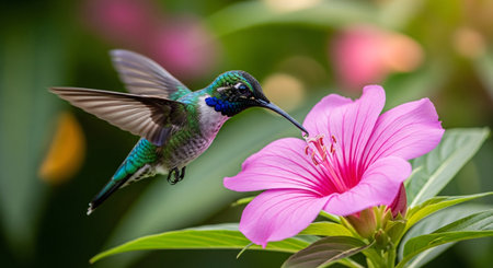 Hummingbird in flight with pink flower in background, hummingbird from tropical forest,beautiful hummingbird from Costa Rica,bird perching on flower in garden,tiny bird in flight