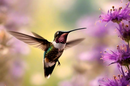 Ruby-throated Hummingbird (archilochus colubris) in flight with a purple flower in the background