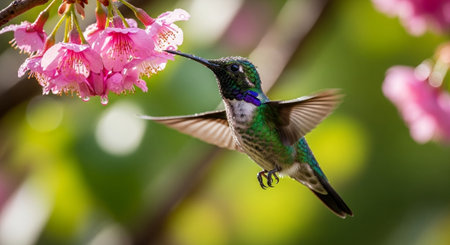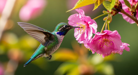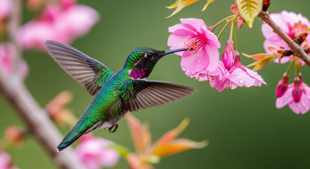 Vibrant hummingbird interacting with pink cherry blossom flowers