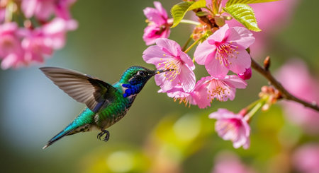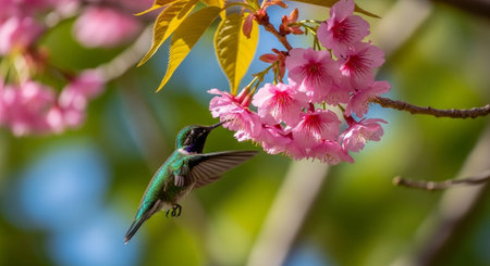 Vibrant hummingbird drinks nectar from delicate pink cherry blossoms