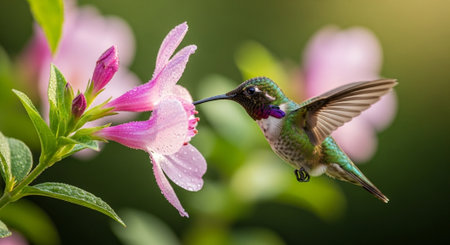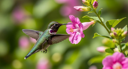 Hummingbird seeks nectar from vibrant pink flower blossoms