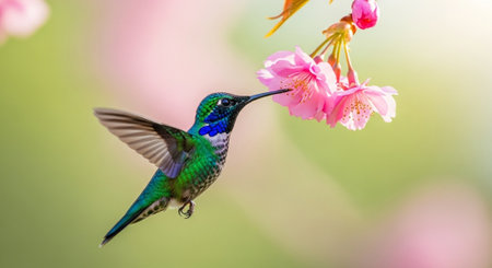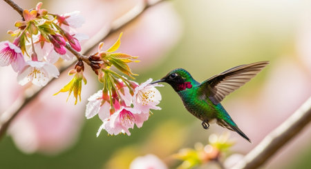 Vibrant hummingbird feeding on pink cherry blossom petals