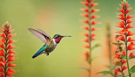 Male Ruby-throated Sunbird (archilochus colubris) flying next to red flower, Costa Rica