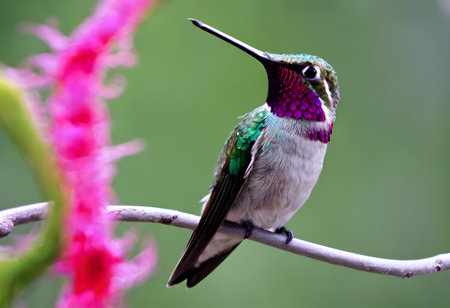 Hummingbird feeding on pink blossoms, vibrant naturalistic illustration