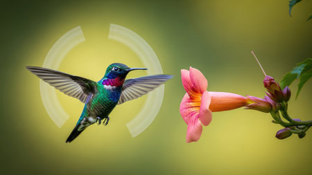 A hummingbird hovers near a vibrant pink flower with green leaves. The bird, with colorful plumage, is captured in mid-flight against a soft green and yellow background. The image has a shallow depth of field, with soft lighting. Potential uses include editorial content and commercial applications.