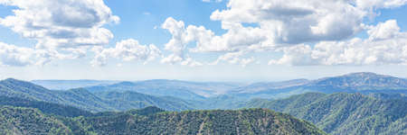 Panoramic image of mountain summer landscape with clouds and green hills