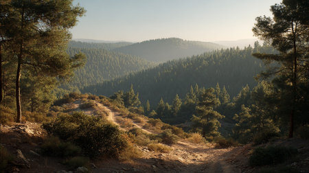 Serene Mountain Vista: Forest Trail Leading to Distant Peaks
