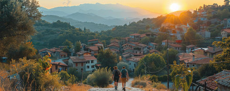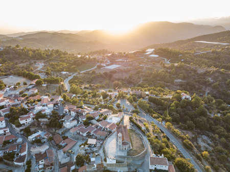 Sunset Aerial view of old mountain Cyprus village Agios Amvrosios, Cyprus 2020