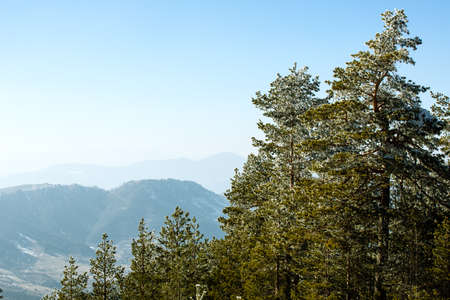 Amazing view from the high coniferous mountains. On a sunny day