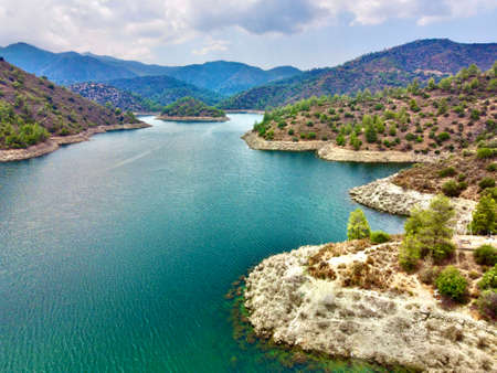 Aerial birds eye drone view of water Lefkara reservoir river lake Cyprus