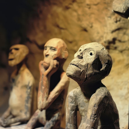 Three intricately carved wooden figures are positioned within a dimly lit cave, showcasing distinct facial expressions and postures. The artwork reflects an ancient civilization's creativity and cultural significance.