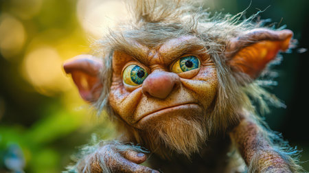 A whimsical creature with green eyes and wild hair displays an intense expression while perched among foliage in a natural setting.