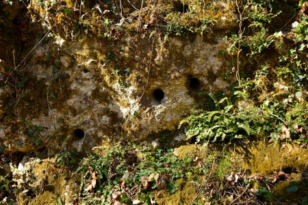 Blasting holes from the placement of explosives in a former quarry in Udine province, Friuli-Venezia Giulia, north east Italy
